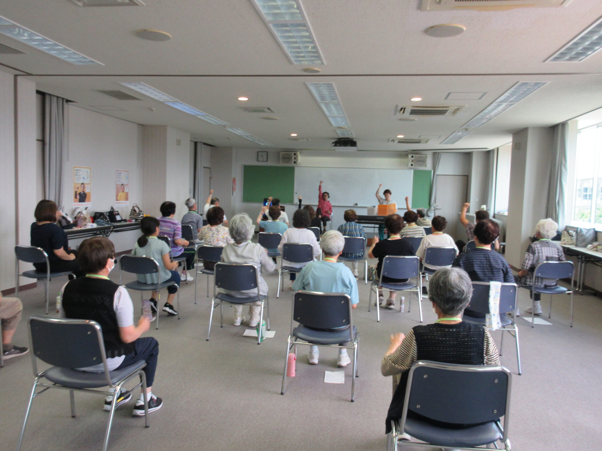 曲に乗せてリズム体操をしたり、背中のトレーニングを行いました。