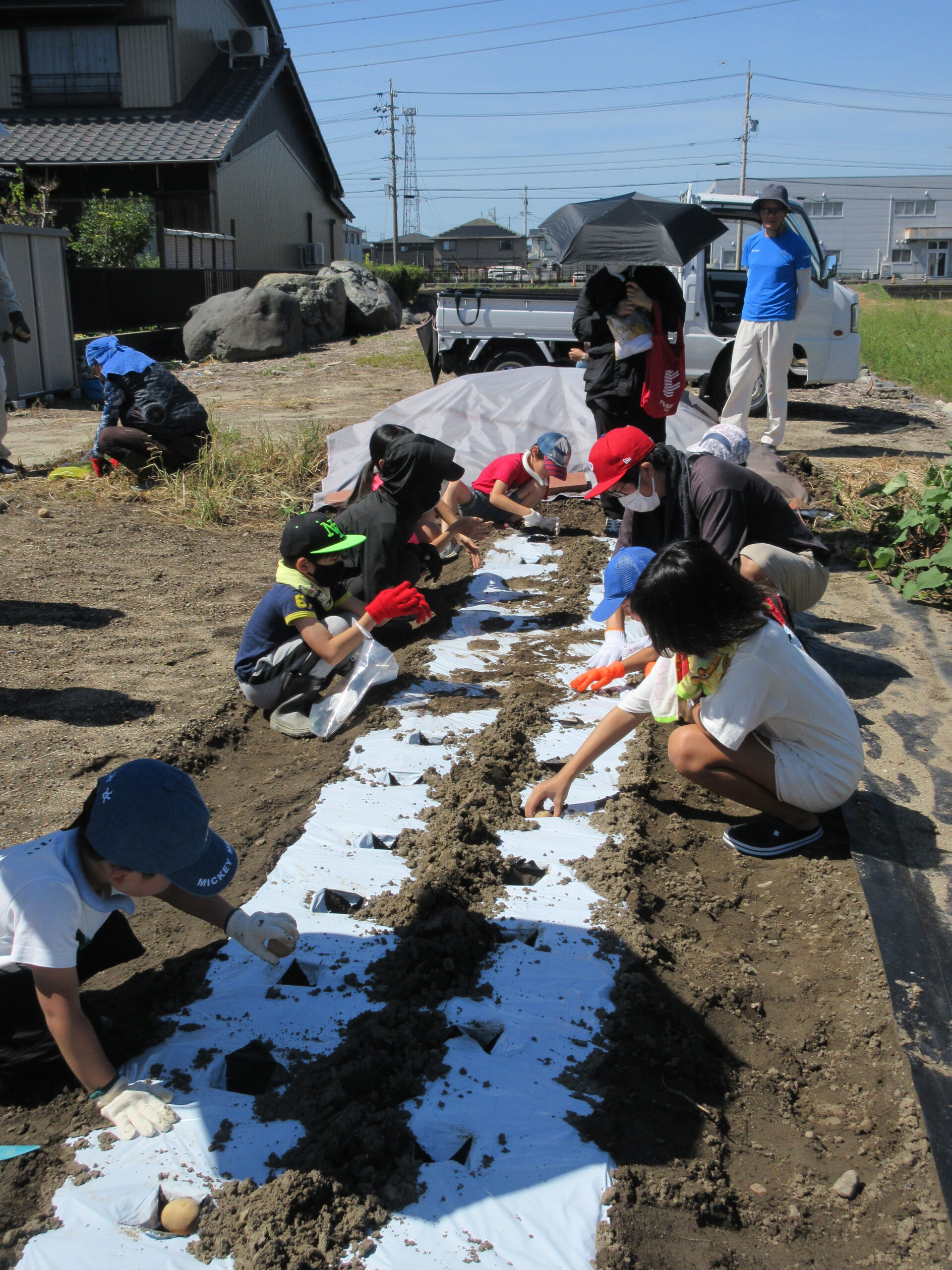 芽の出た種芋を植え、マルチの