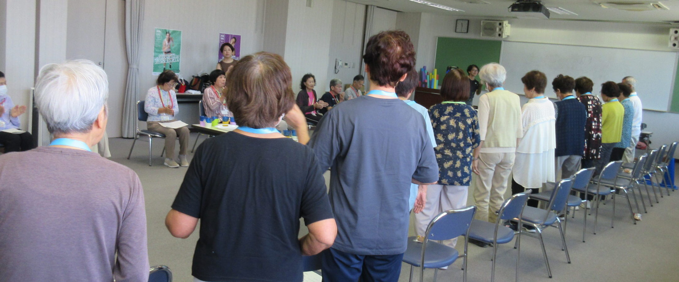実施しました。紅組と青組にわかれて様々な競技をしました。皆さん まるで学生さんに戻られたように熱心に取り組んでおられました。素敵でしたね。応援合戦ではパートナーソングで証城寺の狸ばやしとかたつむりを歌いお上手でした。伝言ゲームで伝わった文で宣誓しましたが、あらあら・・・全く違った文章になって伝わって・・(笑)モンスターけん玉やビーチボール転がし等 お楽しみいただきました。