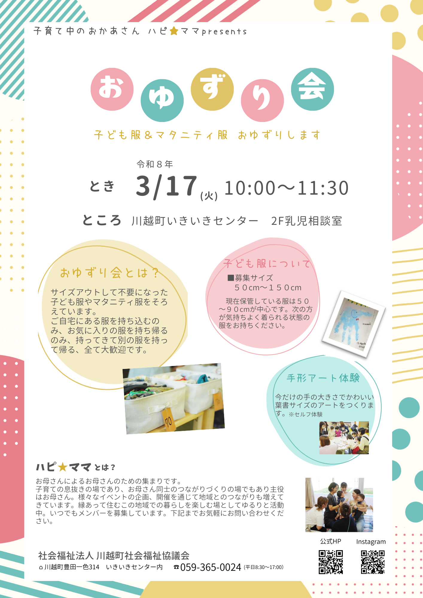 お母さんによるお母さんのための集まり”ハピママ”によるおゆずり会を開催します。
